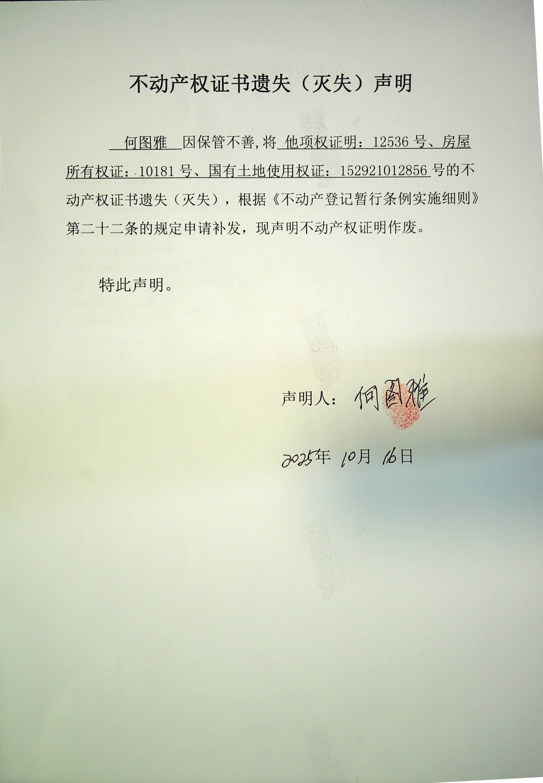 不动产权证书遗失声明(何图雅)