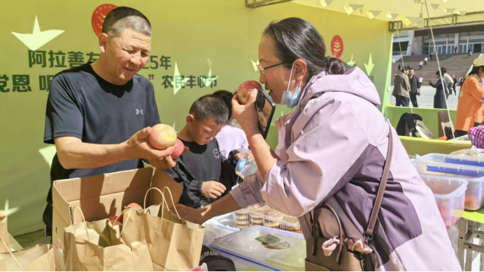 此次丰收节的“C位”,当属热闹非凡的特色农畜产品展销会。步入现场,清甜的瓜果香气扑面而来,满眼皆是琳琅满目的丰收盛景:阿拉善左旗的非遗手作与文创精品独具韵味,巴彦浩特镇的新鲜瓜果蔬菜,敖伦布拉格镇的黄河鱼,银根苏木的羊肉……每一件展品,都源自各苏木镇农牧民亲手种植、精心养殖,承载着他们日出而作、日落而息的辛劳与匠心。